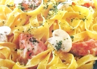 仕上げにレモン汁を入れさっと混ぜて、ゆで上がったフェトチーネを加え全体にソースをからめたら皿に盛りパセリをかけて出来上がり。