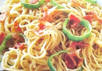ゆで上がったスパゲティとピーマンを入れ手早くあえ皿に盛りベーコンをかけて出来上がり。
