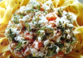 ボールにカッテージチーズ、ほぐしたたらこ、オクラ、ねぎ、サラダ油、しょうゆ、塩少々を入れて混ぜる。ゆで上がったフェトチーネを皿に盛りたらこのソースをのせて出来上がり。